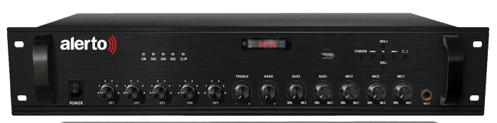 "Моноблок- автоматическая система оповещения на 5 зон. USB, тюнер,микшер-усилитель 240 Вт/100 В, 2 мик, 3 лин входа, контроль линий, блок цифровых сообщений, автоматическое зарядное устройство, напряжение питания 220В (AC)/24 В (DC), RS-485