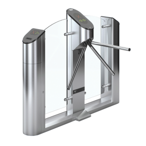 Турникет-трипод электромоторный со стеклом и картоприемником, индикаторы прохода, пульт управления, планки и корпус из нержавеющей стали, крышка из полированного искуственного камня.